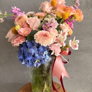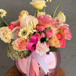 Arreglo de rosas lilas en una hermosa jarra grande
