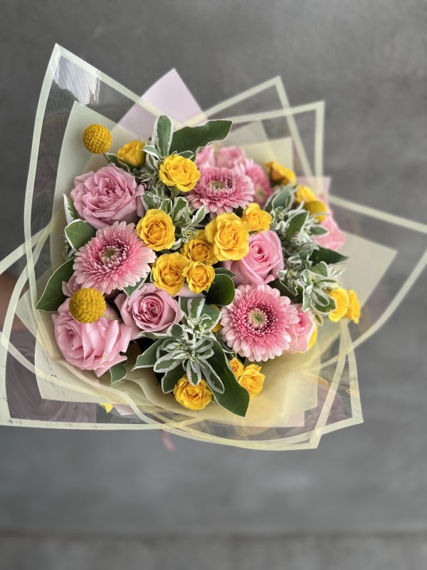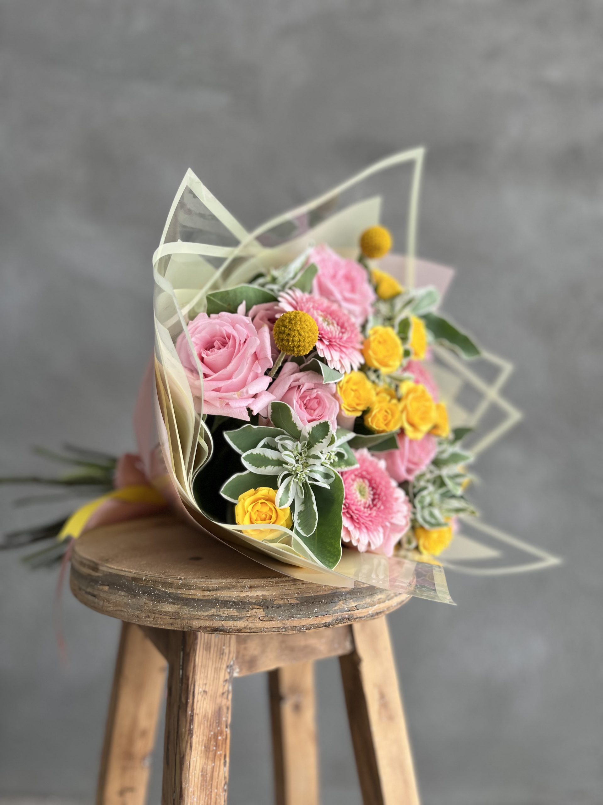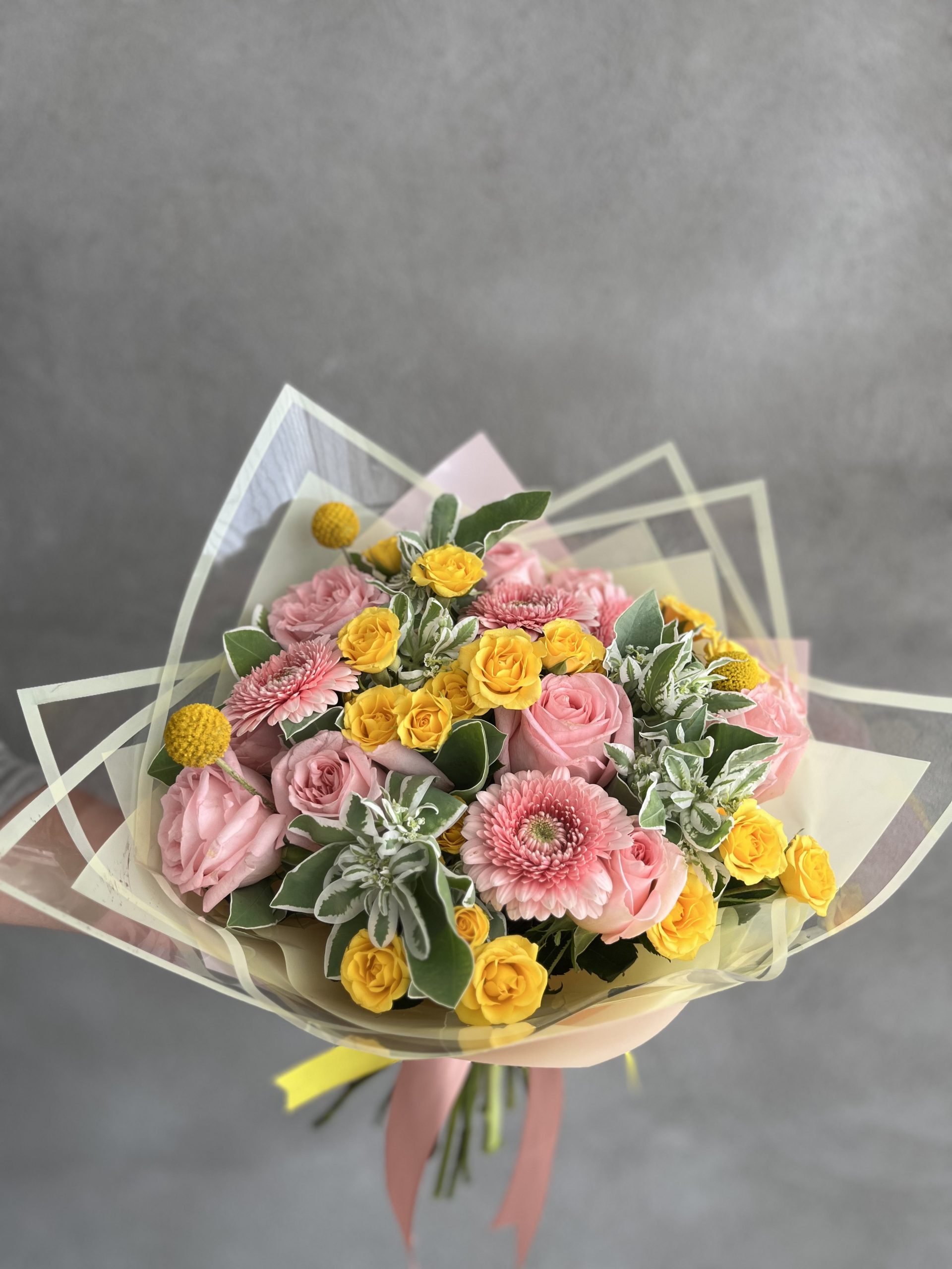 Un ramo diseñado para enamorar con la magia de sus colores. La intensidad del amarillo se une a la suavidad del rosa, creando una composición que simboliza alegría, ternura y esperanza.
