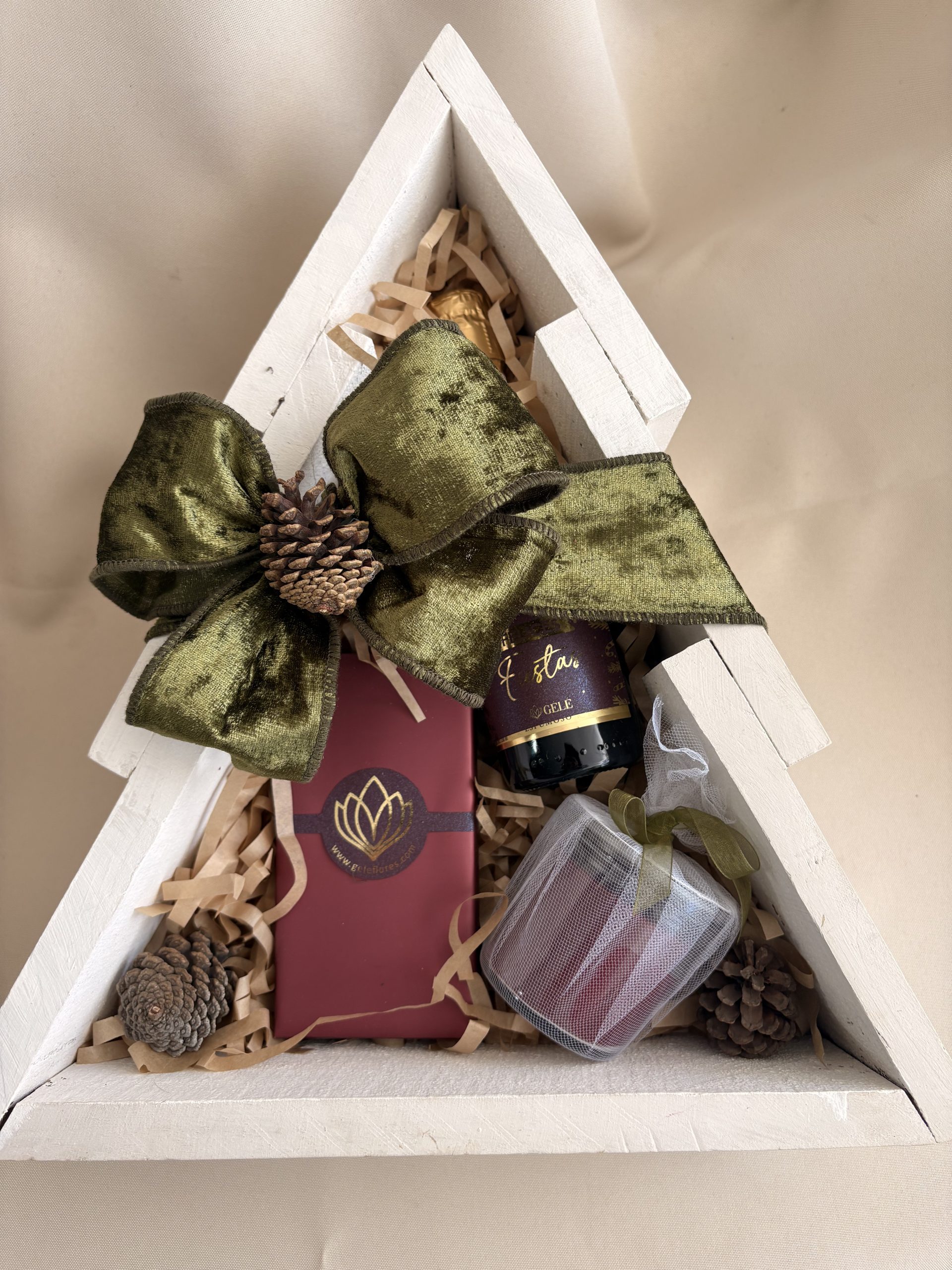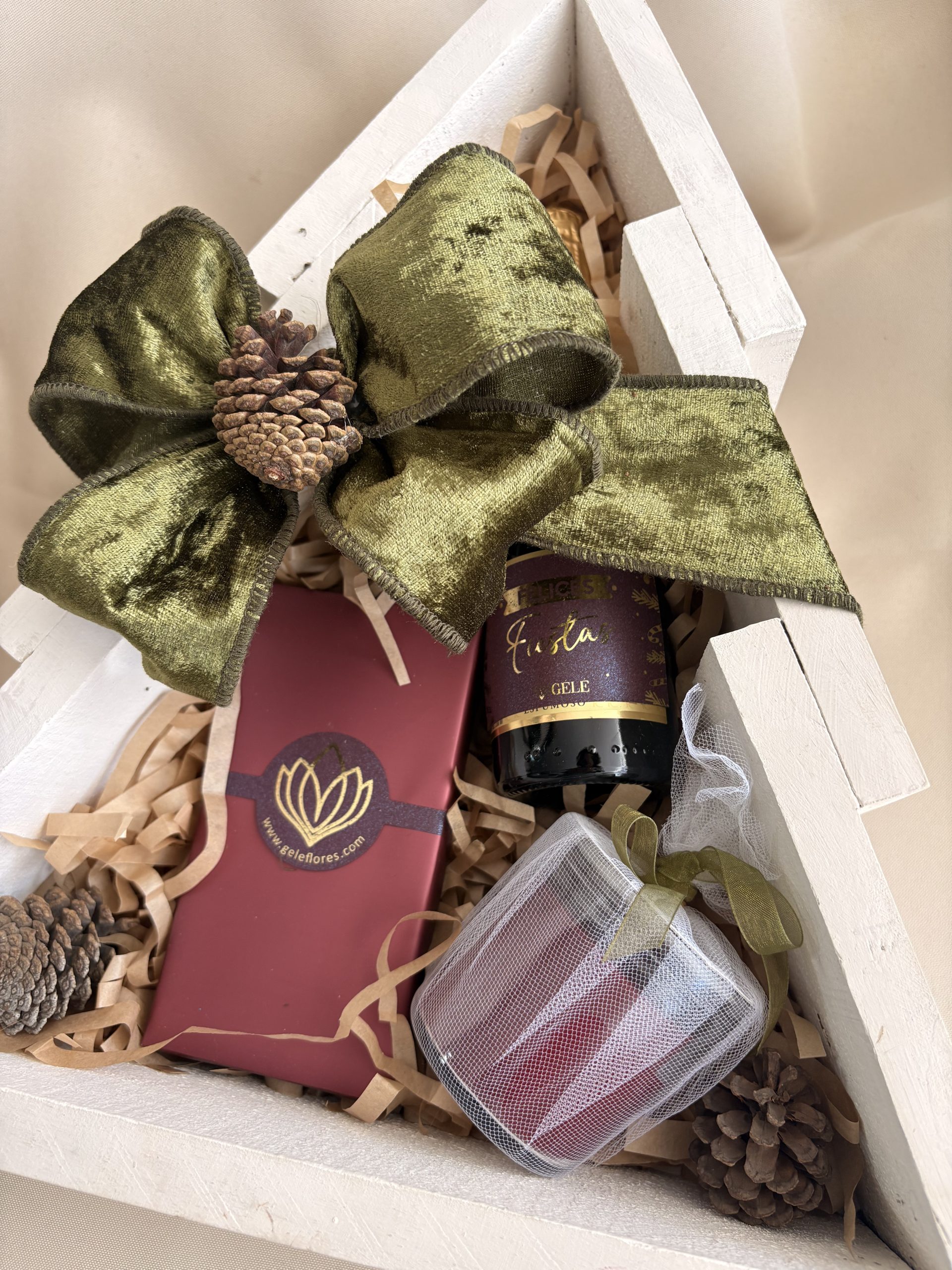 Presentamos nuestra Caja Navideña Rústica Gélé Flores, el regalo perfecto que captura la esencia de la temporada con un toque de elegancia artesanal. Esta hermosa caja con forma de árbol de Navidad en madera blanca es más que un obsequio; es un detalle que decora y endulza, ideal para esa persona especial, un intercambio o como regalo corporativo.