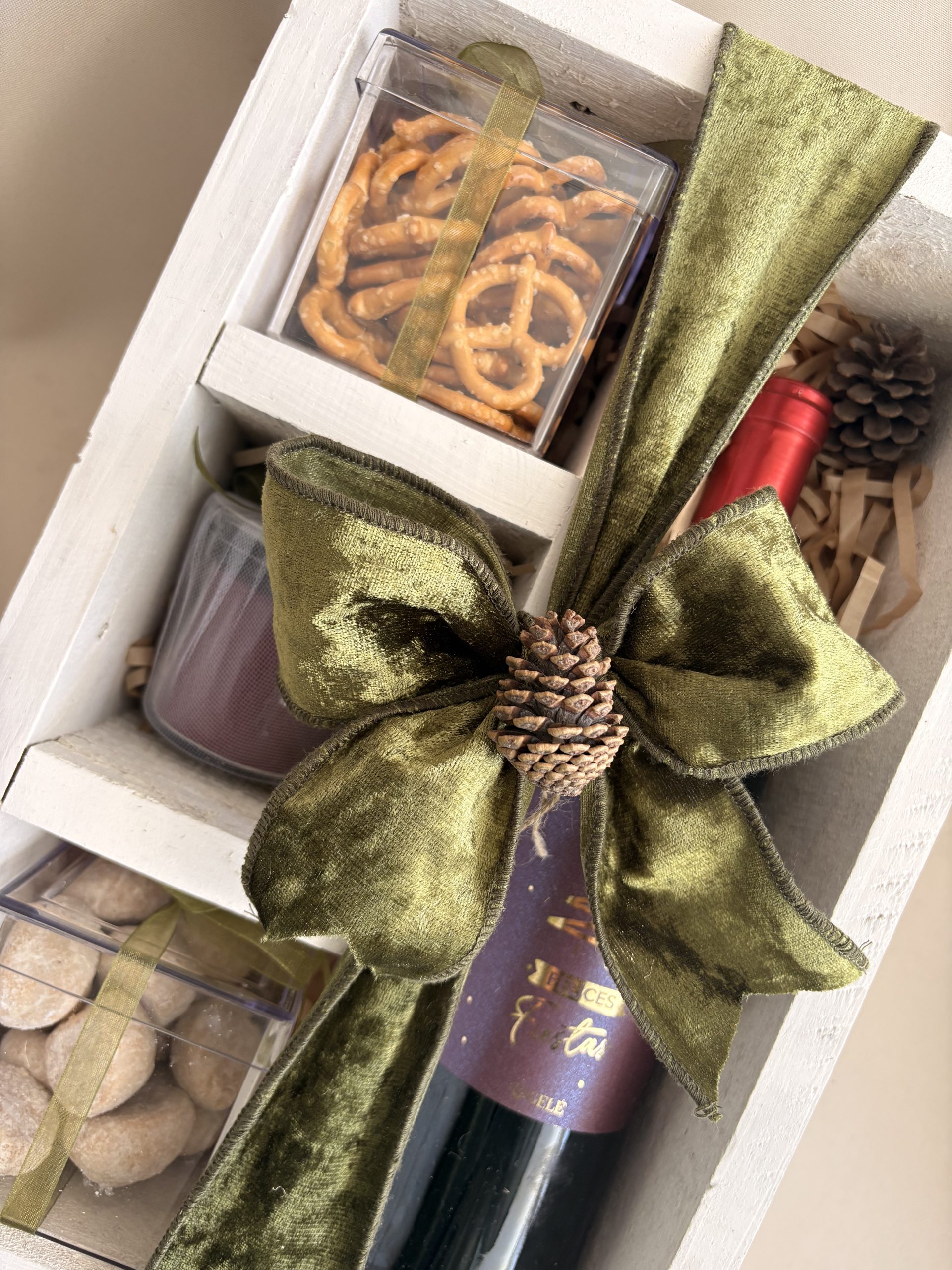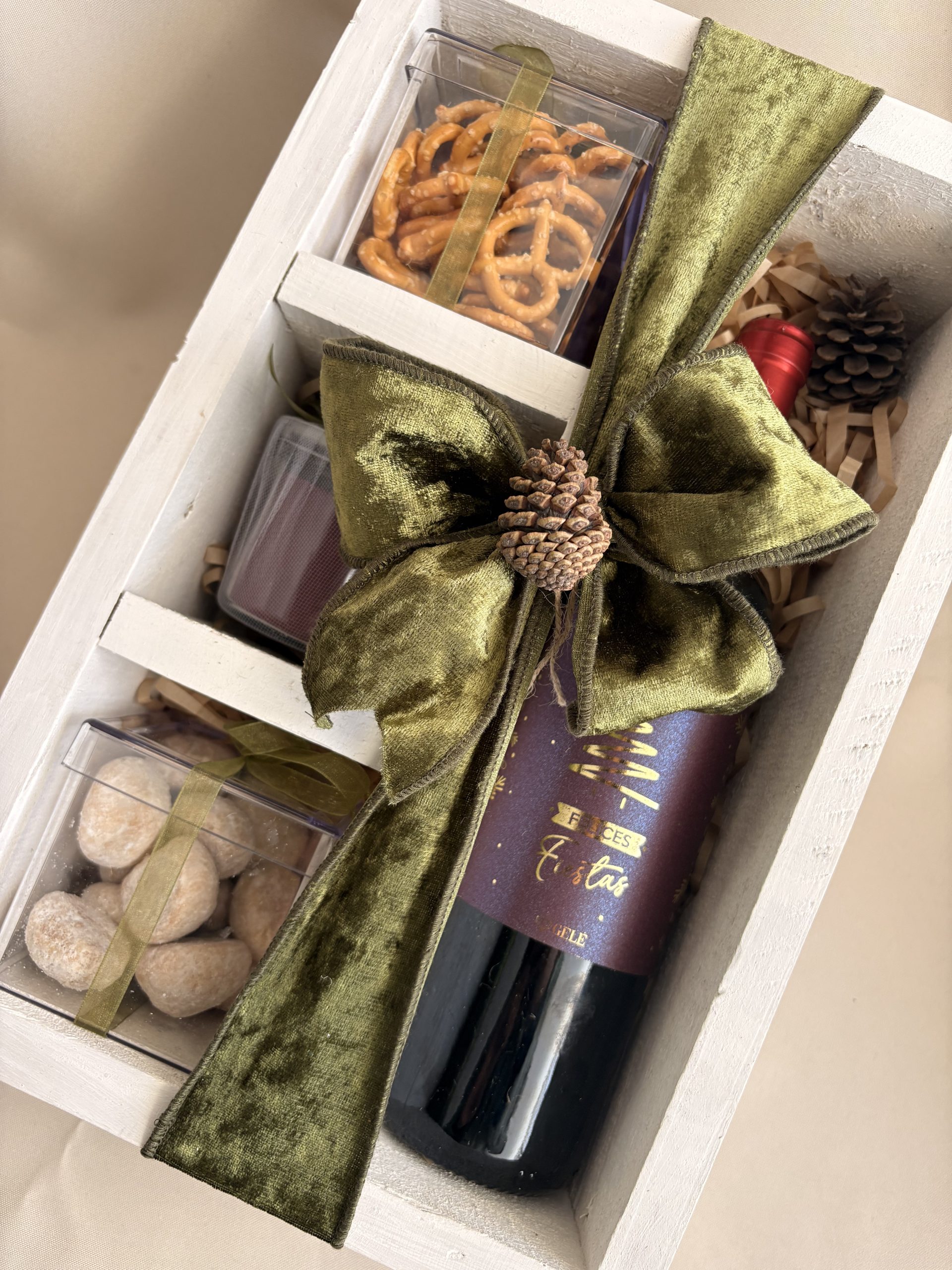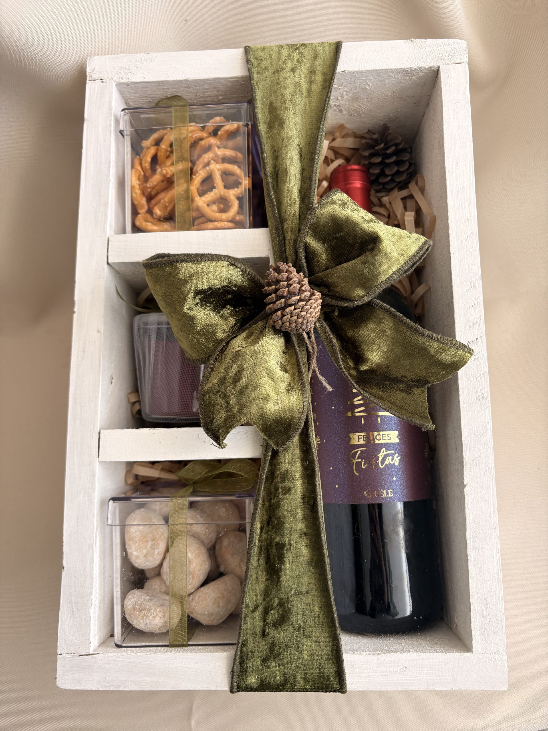 Nuestra Canasta de Maridaje Festivo Gélé Flores es el detalle ideal para elevar cualquier celebración navideña. Presentada en una elegante caja de madera blanca con un diseño compartimentado, esta selección combina un vino de etiqueta exclusiva con una variedad de snacks salados y dulces perfectos para maridar. Es el regalo sofisticado que tus clientes o seres queridos recordarán.
