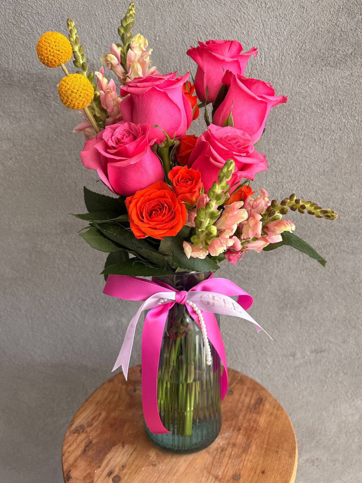 Diseñado en un elegante florero de cristal que realza la frescura de cada flor, este arreglo combina texturas y formas que aportan movimiento y profundidad a la composición. Los delicados listones decorativos complementan el diseño, brindando un toque refinado y distinguido.